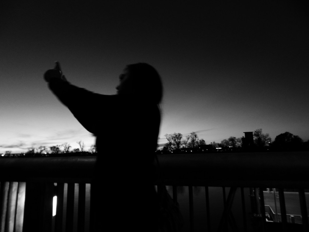 This photo was taken near a river in downtown Sacramento. The woman was taking selfies and wasting quality daylight on that task. Everyone has their own habits. I made the photo dark as it looks better and I feel happier with it.