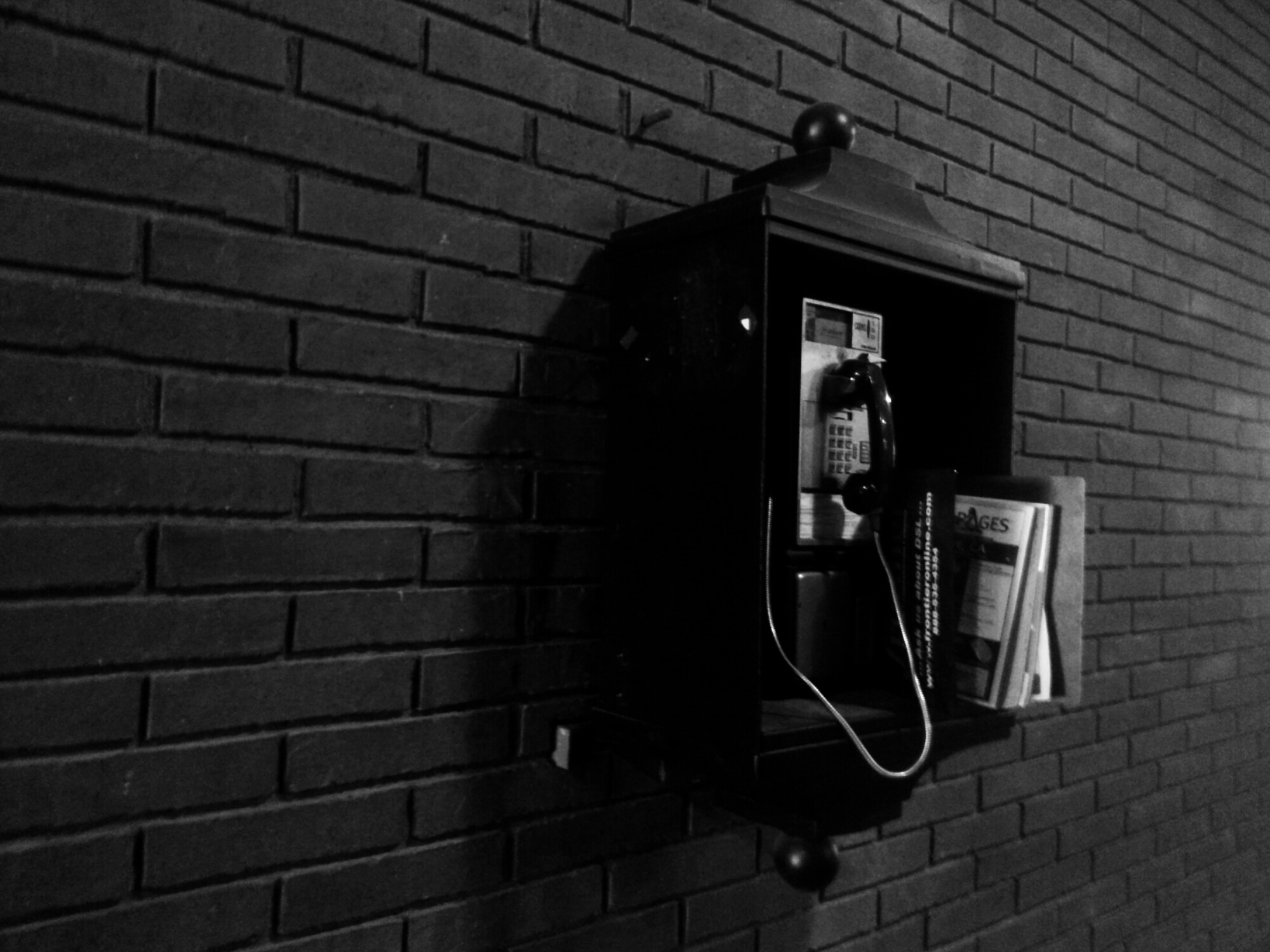 There are still pay phones all around the college I attend. I have always wanted to capture one. On that day, I happened to find one in a wonderful area and snapped away. I love the darkness around it but also the light of the bricks. Going to start a project where I capture objects and places that are no longer relevant in the society we live in but were apart of my childhood.