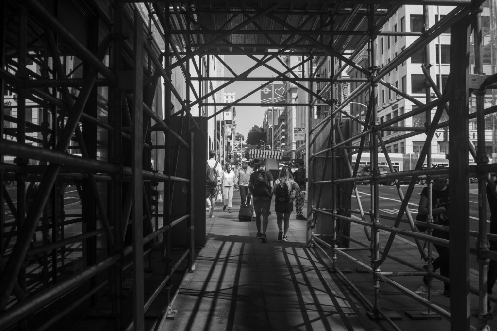 There was quite a bit of construction going on wherever I went in San Francisco. I liked the atmosphere as I walked under the scaffolding so I took a few shots. I like the crookedness of it, I believe it works, however, will need to work on composition. I do like the man next to the girl is stepping out of the center shadow. After reviewing my shots, I really do see where I can improve.