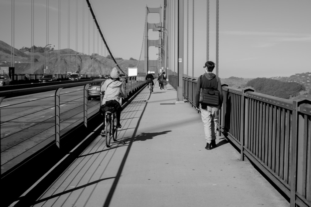 Another simple shot on the Golden Gate Bridge. It was really sunny that day, so I had a lot of fun with shadows. Although editing them to make them less harsh is a pain. Now that I am looking at it again, I find myself wondering if the composition would be better if the people in the middle were not in the shot. I really just wanted to capture the two girls on the bikes. They were Korean tourists that stopped every few minutes to pose for instagram photos. I was able to capture them in motion as they are pedaling which I liked. Also caught my friend on the right preparing to stop and to turn around to ask me “want to turn back around?”